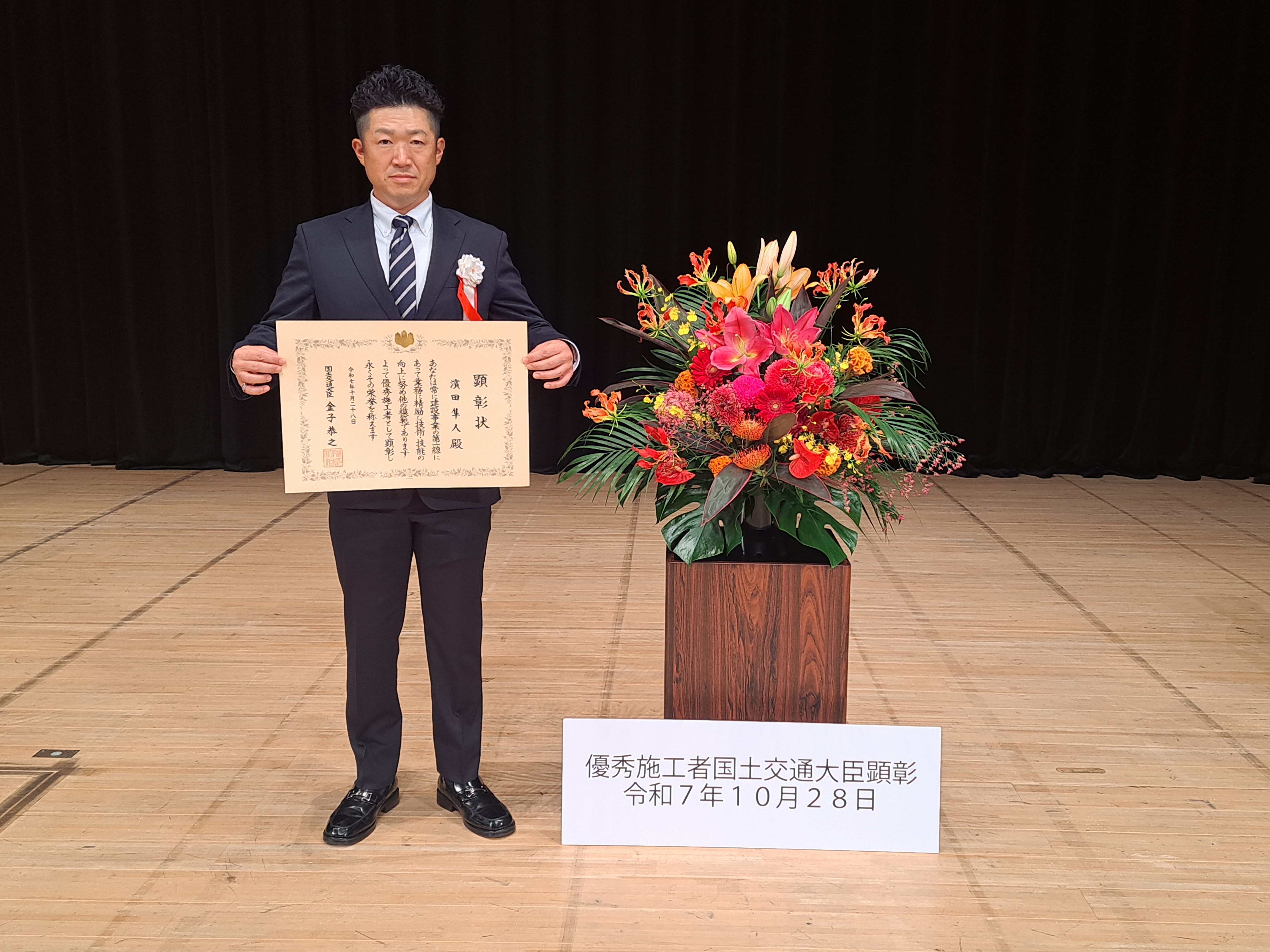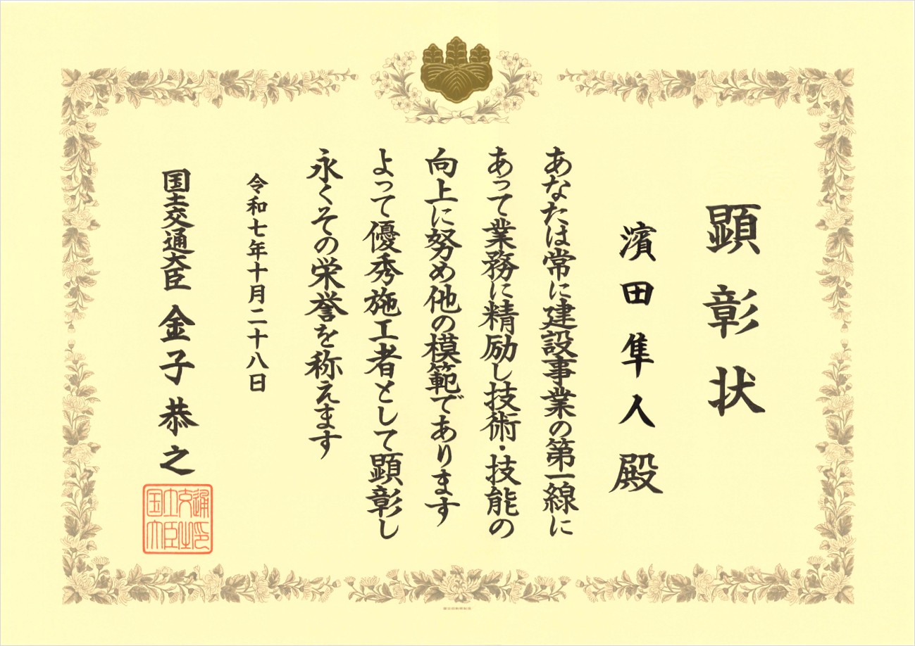 国土交通大臣 金子 恭之 様より令和7年度 優秀施工者国土交通大臣顕彰(建設マスター)を拝受いたしました。