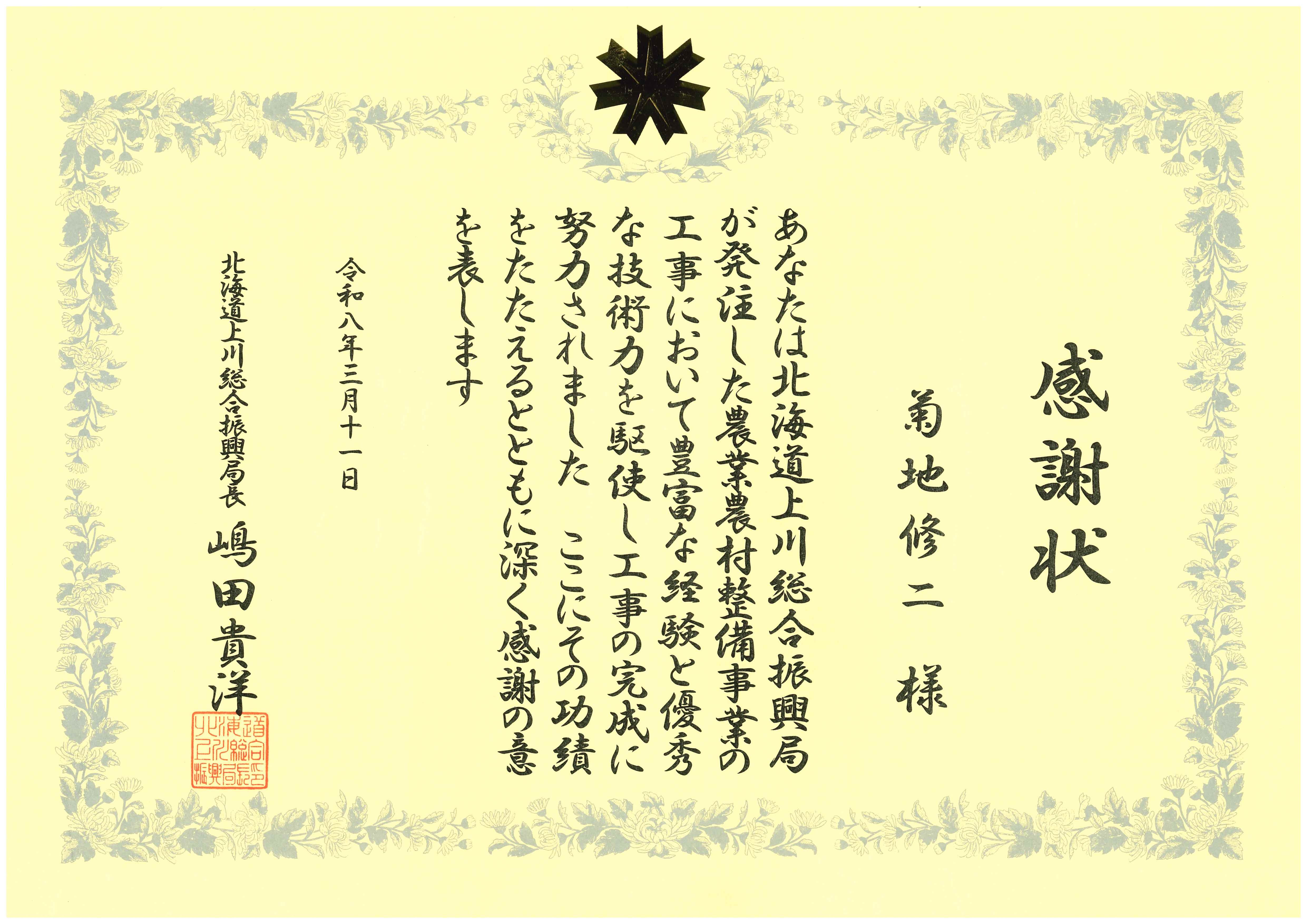 「経営体 東中東部地区 42工区」の施工において、豊富な経験と優れた技術力を駆使し、工事の完成に尽力した功績が評価され、北海道上川総合振興局長 嶋田 貴洋 様より感謝状を拝受しました。